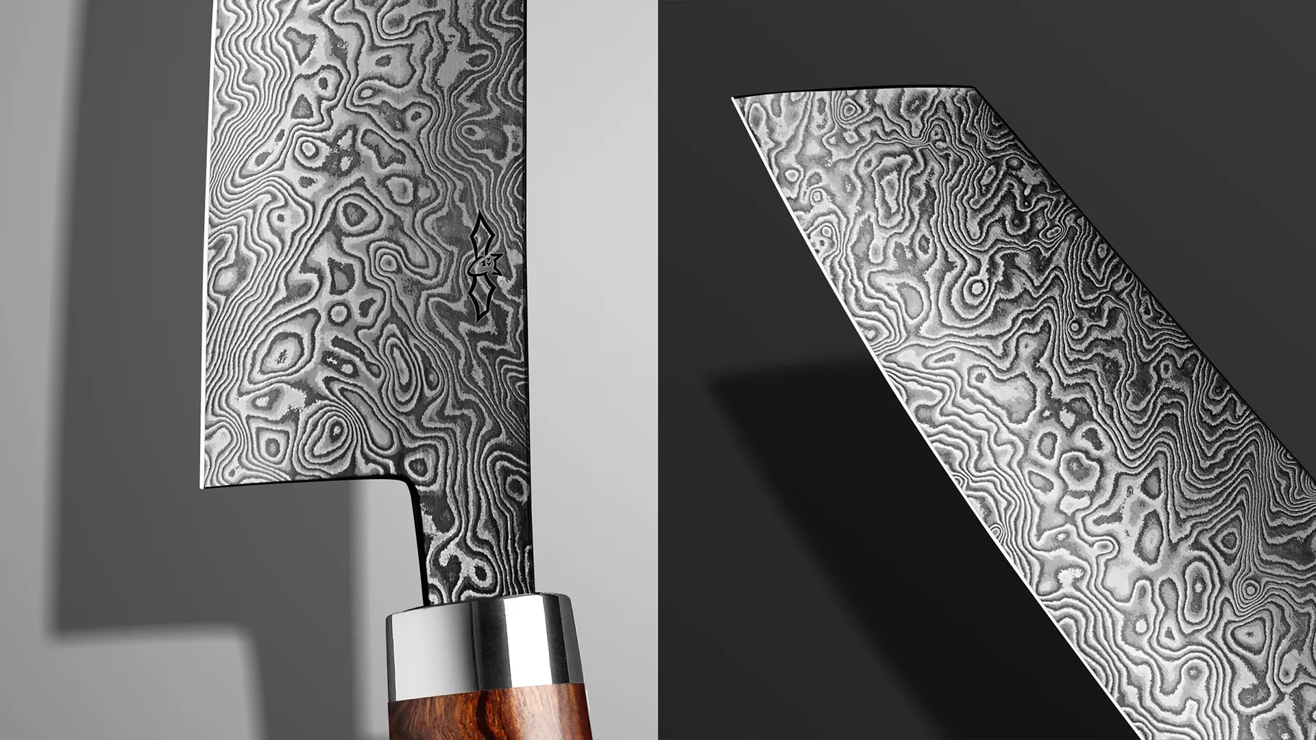 Die C150 Serie hebt sich durch ihre noch präziser abgestimmte Legierung und ein besonders kontrastreiches Damastmuster ab. Jede Klinge wird in aufwendiger Handarbeit geschliffen, um die Schneidlage aus reinem Kohlenstoffstahl optimal hervorzuheben. Der beidseitige, facettierte Hohlschliff ist eine meisterhafte Veredelung, die nicht nur optisch beeindruckt, sondern auch die Schneideigenschaften perfektioniert.