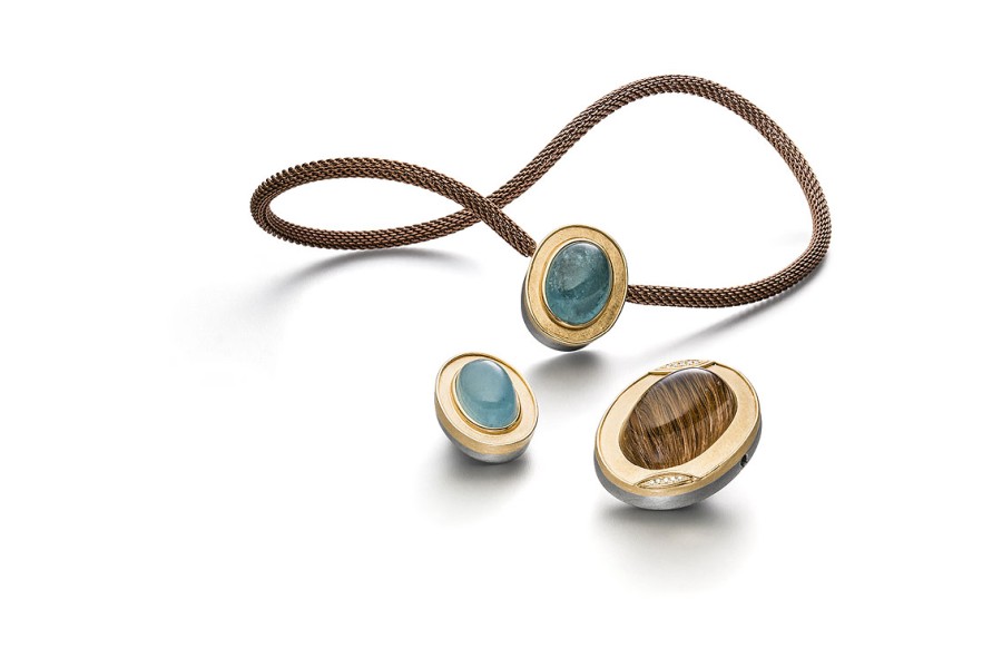 Raffinierte Kombinierbarkeit in hochwertiger Ausführung – Dafür stehen die überwiegend handgefertigten Schmuckstücke von Marcel Roelofs. Im Handumdrehen lassen sich die Schließen austauschen. Darüber hinaus hat die Trägerin die Wahl zwischen verschiedenen Ketten (Perlen- oder Steinketten, Gold- oder Edelstahlschnüre), in die sich die Schließen per Bajonettverschluss einsetzen lassen.